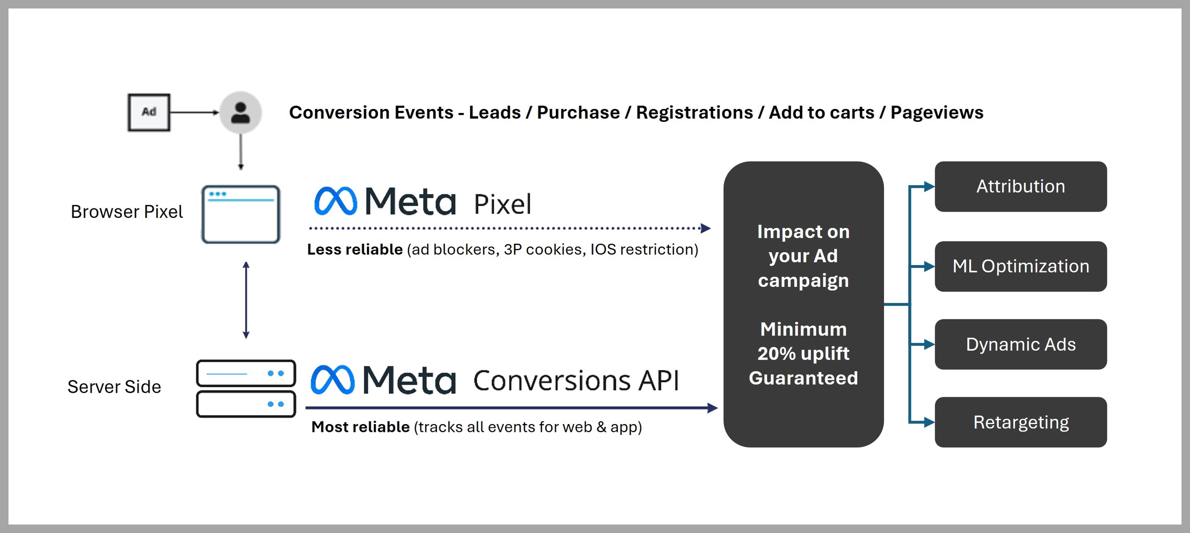 Our approach revolves around the “we drive and you lead model,” specifically crafted for advertiser and marketing agencies. Under this exclusive arrangement, we handle the entire conversion API setup and implement at our cloud, allowing you to take the control of events at your events manager